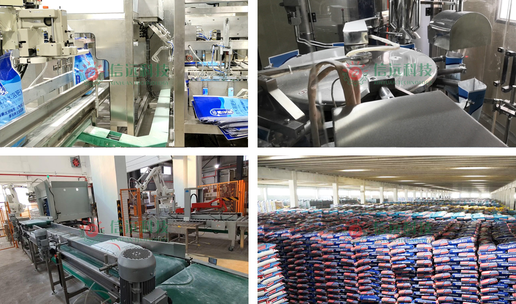 該套方案需要把不同配方的原料,投入原料倉后,進入自動配料和自動混合工段,結塊原料和顆粒原料,配有自動破碎和粉碎系統(tǒng)。配混均勻后的原料自動卸料至包裝機上方的緩存料倉,通過螺旋給料的方式,自動計量充填進入包裝袋,包裝機內置除塵系統(tǒng),包裝過程為全自動化作業(yè),無需人工參與。重袋包裝系統(tǒng)可以自動完成取袋、上袋、開袋、套袋、夾袋和計量充填,袋內重量達到設定值時,自動停止充填、自動松袋落袋、抱袋裝置自動推送至縫包機/熱封口機,完成包裝袋封口。成品袋在輸送過程中,自動完成倒包、振實、壓平等理包整形后,機器人進行碼垛,叉車搬運入庫。小袋包裝系統(tǒng)同樣可以自動完成取袋、上袋、打碼、開袋、充填、振實和封口,成品袋由機器人進行二次裝箱(裝箱生產線配有上箱開箱系統(tǒng)),箱內達到設定袋數(shù)后,自動進入封箱打包工段,機器人進行碼箱作業(yè),叉車搬運入庫。