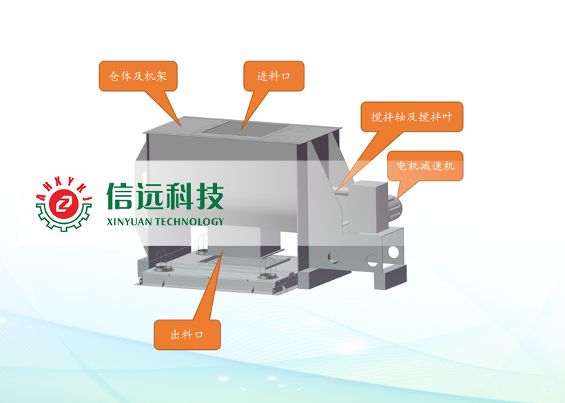 由倉體及機架、進料口、攪拌軸及攪拌葉、電機減速機、出料口幾大部分組成。