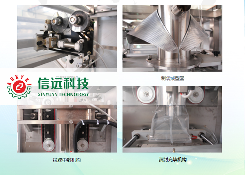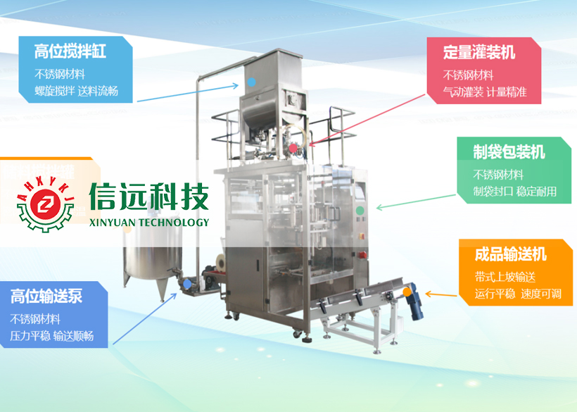 信遠(yuǎn)科技液體全自動(dòng)立式制袋包裝機(jī)組,是由密閉攪拌罐、物料輸送泵、定量灌裝機(jī)、制袋包裝機(jī)和成品輸送機(jī)組成??梢园b單袋克重在30-5000g范圍之間的液體物料,生產(chǎn)企業(yè)可以根據(jù)自己的需求選擇不同的設(shè)備型號(hào)。這套機(jī)組設(shè)備適用于食品、化工、醫(yī)藥等行業(yè)的流體、半流體物料的定量包裝,具有自動(dòng)完成攪拌、送料、計(jì)量、制袋、灌裝、封口、切包、打印、計(jì)數(shù)、輸送等一系列功能。