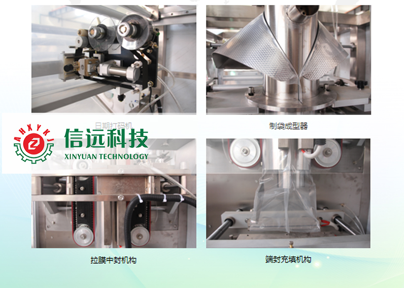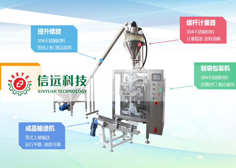 信遠(yuǎn)科技粉劑全自動立式制袋包裝機(jī)組,是由密閉螺旋提升機(jī)、螺旋計(jì)量機(jī)、立式制袋包裝機(jī)和成品輸送機(jī)組成,可以包裝單袋克重在30-5000g范圍之間的粉狀物料,生產(chǎn)企業(yè)可以根據(jù)自己的需求選擇不同的包裝機(jī)型號。這套機(jī)組設(shè)備適合粉料和較大粉塵的超細(xì)粉狀物料的定量包裝,具有自動完成送料、計(jì)量、制袋、充填、封口、切包、打印、計(jì)數(shù)、輸送等一系列功能,是食品、化工、醫(yī)藥等行業(yè)提高包裝生產(chǎn)效率,打造無塵環(huán)保車間,提升包裝檔次的必選設(shè)備。