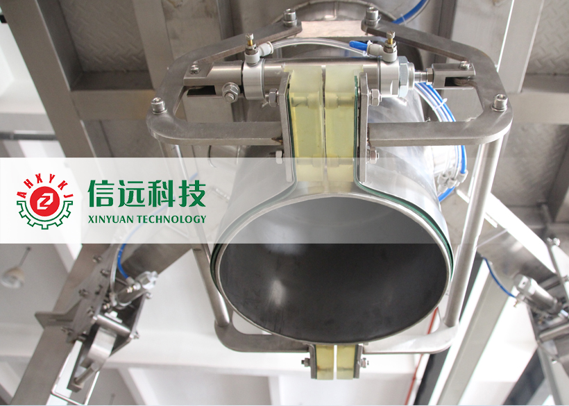 該工段采用升降式結構設計。在物料充填前,人工在下料口套袋,并把包裝袋吊帶掛在四個掛耳上,按下啟動按鈕,下料口夾袋氣缸開始工作并夾住袋口,升降氣缸將包裝袋提升,風機吹氣脹袋,控制系統(tǒng)通過參數(shù)設定將袋皮重量自動去除,驅動喂料機構運轉,物料自動下落,下料過程中,自動排氣除塵,同時可以開啟自動敦袋功能(敦袋次數(shù)可任意設定),達到設定重量停止下料,包裝袋自動降落到下面的輸送機上,夾袋氣缸松開袋口,吊帶自動脫鉤,輸送機自動啟動把包裝袋運送至下一工序。