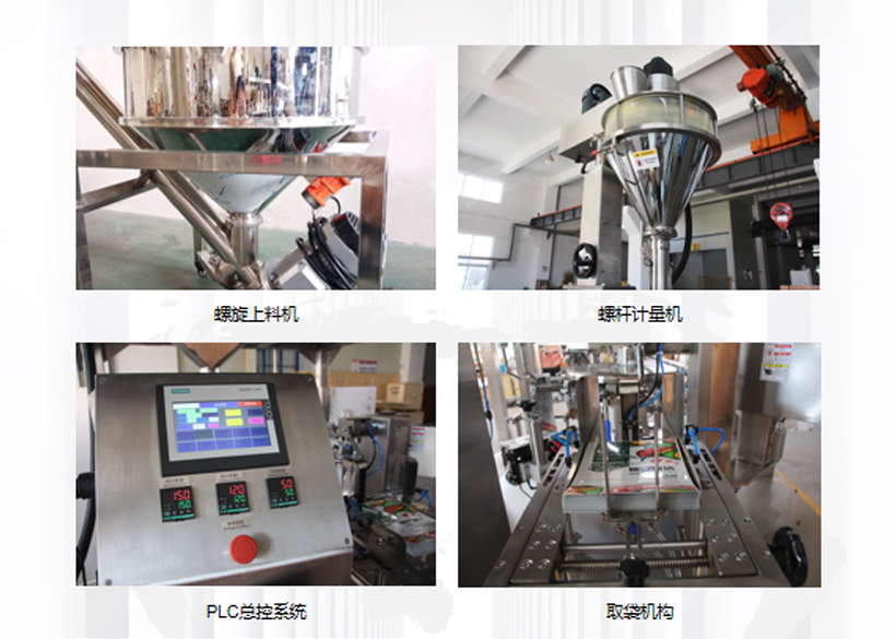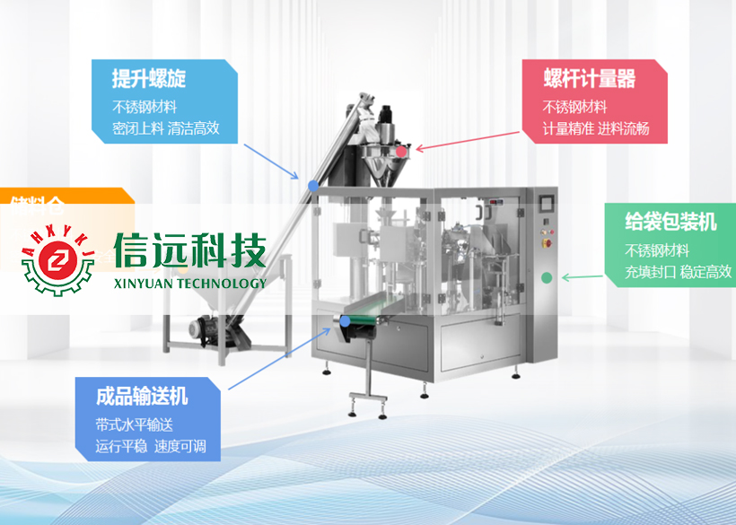 信遠(yuǎn)科技粉劑全自動(dòng)旋轉(zhuǎn)式給袋包裝機(jī)組,是由密閉螺旋提升機(jī)、螺旋計(jì)量機(jī)、多工位旋轉(zhuǎn)式給袋包裝機(jī)和成品輸送機(jī)組成。可以包裝單袋克重在30-5000g范圍之間的粉狀物料,生產(chǎn)企業(yè)可以根據(jù)自己的需求選擇不同的包裝機(jī)型號(hào)。這套機(jī)組設(shè)備適合無粘性粉料的定量包裝,具有自動(dòng)完成送料、計(jì)量、給袋、充填、封口、打印、計(jì)數(shù)、輸送等一系列功能,是食品、化工、醫(yī)藥等行業(yè)提高包裝生產(chǎn)效率,打造無塵環(huán)保車間,提升包裝檔次的新型自動(dòng)化裝備。