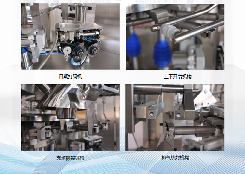 包裝機(jī)根據(jù)程序設(shè)計(jì),自動(dòng)完成取袋、立式上袋、打碼、開袋、充填、振實(shí)、熱封以及整形輸出等各工位的有序運(yùn)行。