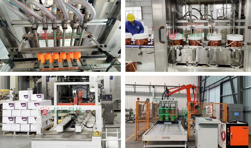 瓶裝灌裝系統(tǒng)適用于100-1000ml容量范圍內(nèi)的液體肥產(chǎn)品灌裝??梢宰詣?dòng)完成理瓶進(jìn)瓶和計(jì)量灌裝,當(dāng)瓶?jī)?nèi)重量達(dá)到設(shè)定值時(shí),自動(dòng)停止灌注,在輸送系統(tǒng)的推動(dòng)下,出瓶至自動(dòng)上蓋旋蓋、鋁箔封口、噴碼貼標(biāo)和封箱打包工段,完成成品下線。桶裝灌裝系統(tǒng)適用于5-30L容量范圍內(nèi)的方桶、圓桶、廣口桶和小口桶的液體肥產(chǎn)品灌裝??梢宰詣?dòng)完成定位進(jìn)桶、稱重灌裝、上蓋壓蓋、噴碼追溯和機(jī)器人碼桶等不同工序作業(yè)。