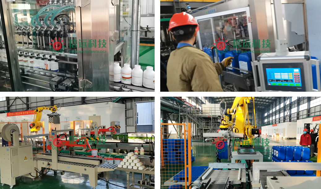 瓶裝灌裝系統(tǒng)適用于100-1000ml容量范圍內(nèi)的液體肥產(chǎn)品灌裝。可以自動(dòng)完成理瓶進(jìn)瓶和計(jì)量灌裝,當(dāng)瓶?jī)?nèi)重量達(dá)到設(shè)定值時(shí),自動(dòng)停止灌注,在輸送系統(tǒng)的推動(dòng)下,出瓶至自動(dòng)上蓋旋蓋、鋁箔封口和噴碼貼標(biāo)工段,自動(dòng)上箱開箱機(jī)把空箱輸送至裝瓶工段,當(dāng)箱內(nèi)裝滿設(shè)定瓶數(shù)后,進(jìn)入箱碼關(guān)聯(lián)、封箱捆扎和機(jī)器人碼箱工段,完成成品下線。桶裝灌裝系統(tǒng)適用于5-30L容量范圍內(nèi)的方桶、圓桶、廣口桶和小口桶的液體肥產(chǎn)品灌裝??梢宰詣?dòng)完成上桶進(jìn)桶、稱重灌裝、上蓋壓蓋/旋蓋、噴碼追溯和機(jī)器人碼桶等作業(yè)工序,成品由叉車搬運(yùn)入庫(kù)。