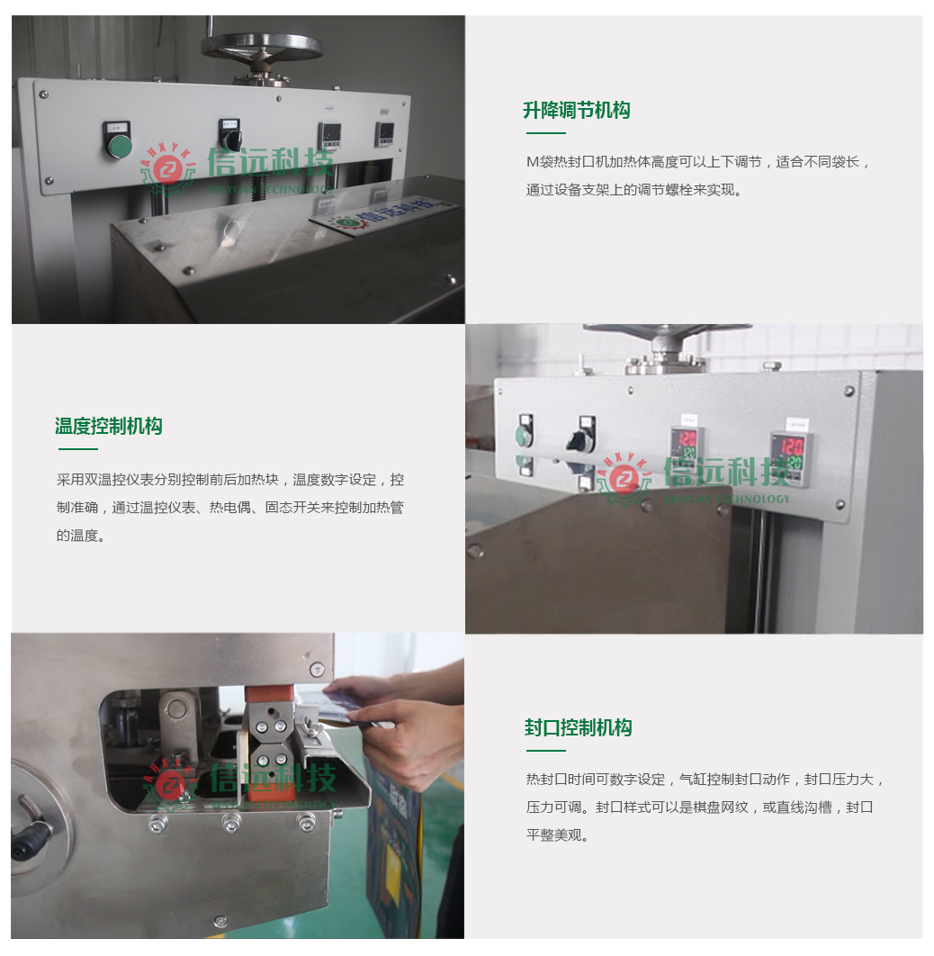 XY-M500/T型熱封口機是我公司針對需熱封口的包裝袋開發(fā)的產(chǎn)品,它采用雙溫控儀表分別控制前后加熱塊,溫度控制準確,氣缸控制封口動作,適合多種熱封口包裝袋使用。既可用于一字平口袋,也可用于M折邊袋封口。封口方式水平與垂直角度可調(diào)。適用用包裝袋尺寸: 寬度≦480mm;最大長度≦1100mm;