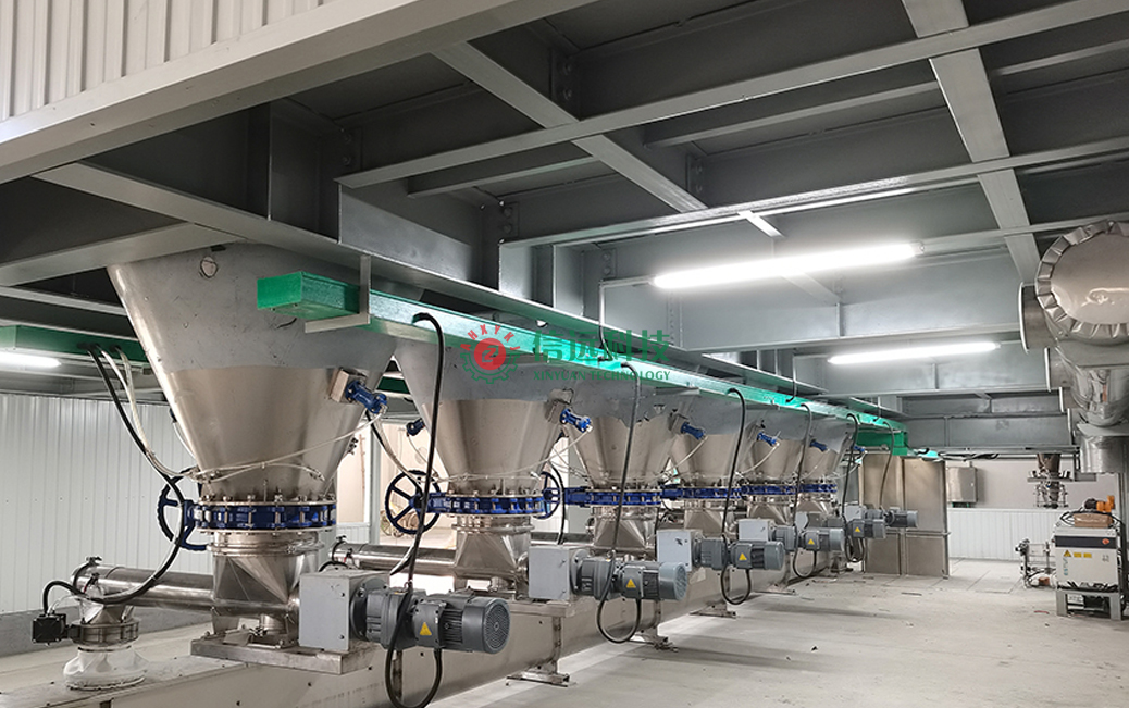 過渡料倉下方連接的是配料倉。配料倉為圓錐形結(jié)構(gòu),由料倉主體、料倉蓋、連接法蘭、稱重底座,振動底座、減壓帽等組成,內(nèi)鏡面材質(zhì)、無死角。每個配料倉為獨立稱重設(shè)計,配料快、精度高,各料倉主體連接螺旋輸送機,供料電機帶動螺桿轉(zhuǎn)動配料,變頻控制輸料速度,快、慢兩級加料,可有效控制配料精度,也被稱為矢量法自動配料,是一套技術(shù)非常成熟的配料系統(tǒng)。