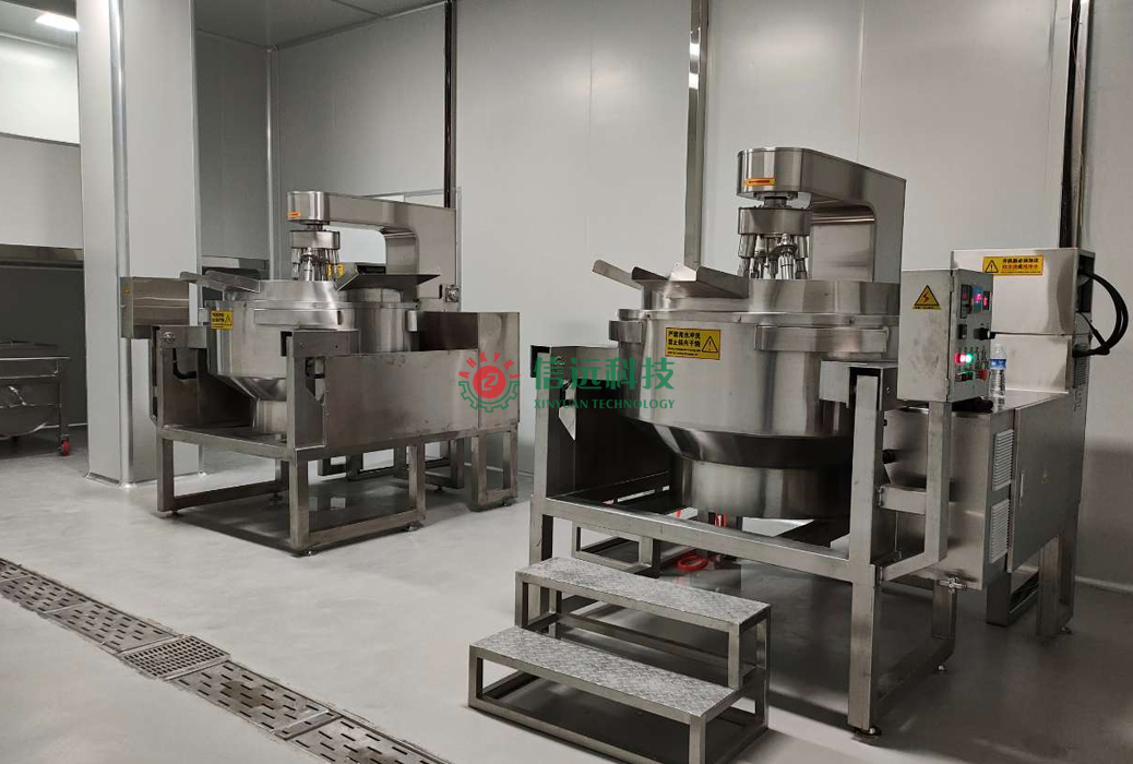 信遠(yuǎn)科技電磁炒鍋熬油炒料一體機,容積大、產(chǎn)量高、升溫快、溫度高,攪拌無死角,不粘鍋、糊鍋,配有溫度顯示裝置,可設(shè)定溫度,到達(dá)溫度自動斷電??蓪崿F(xiàn)單控、雙控,從而調(diào)控功率大小。其外掛設(shè)計更人性化,操作、清洗使用更合理,液壓傾斜倒料系統(tǒng)更穩(wěn)定可靠,被廣泛應(yīng)用于食品業(yè)加工中。適用于各種高粘度醬料的攪拌加熱蒸煮炒制:肉制品熟食加工業(yè)(魚子醬、肉醬、海鮮醬),調(diào)味品業(yè)(火鍋底料、燒烤醬料、方便面醬料),蔬菜醬類業(yè)(辣椒醬、香菇醬、蘑菇醬)等食品加工業(yè),生產(chǎn)的醬料質(zhì)量穩(wěn)定,效果好。