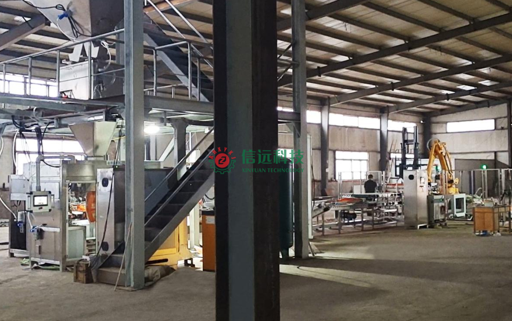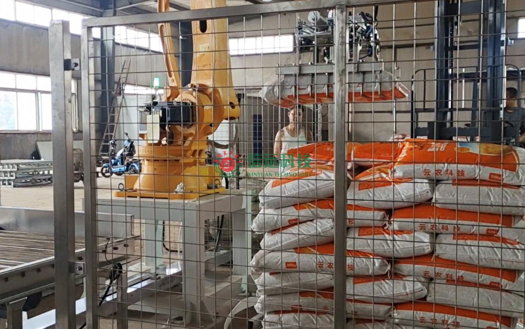 安徽信遠(yuǎn)包裝科技有限公司設(shè)計(jì)制造的摻混肥全自動包裝碼垛生產(chǎn)線設(shè)備,是一套重袋包裝碼垛系統(tǒng),由上袋機(jī)、包裝機(jī)、縫包機(jī)、噴碼機(jī)、輸送理包系統(tǒng)和碼垛機(jī)器人等裝置組成,可以自動完成取袋、上袋、開袋、套袋、夾袋和計(jì)量充填,袋內(nèi)重量達(dá)到設(shè)定值時,自動停止充填并松袋落袋,抱袋裝置自動移栽至縫包機(jī)前,完成包裝袋封口。成品袋在輸送過程中,自動完成倒包、振實(shí)、壓平等理包整形后,機(jī)器人進(jìn)行抓包碼垛,叉車搬運(yùn)入庫。