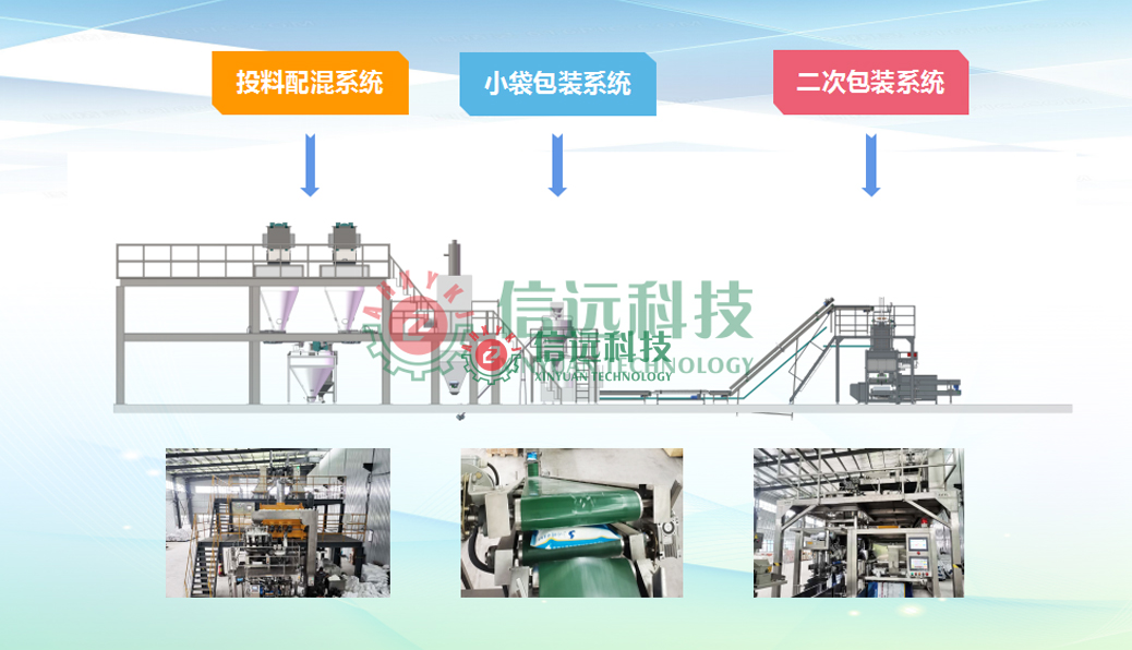 信遠(yuǎn)科技化工粉劑配混包裝+二包生產(chǎn)線設(shè)備,是一套需要“兩次包裝過程”的全自動化生產(chǎn)線。該裝置前端配置有投料配混設(shè)備,后端配置有小袋包裝機和重袋包裝機。小包裝在快速完成生產(chǎn)后,通過夾包輸送機提升到二包平臺,然后計數(shù)定量灌裝至大包裝袋,在完成大袋封口后進(jìn)入理包輸送碼垛入庫。該套生產(chǎn)線設(shè)備適用于生產(chǎn)多種類型的化工粉劑產(chǎn)品。