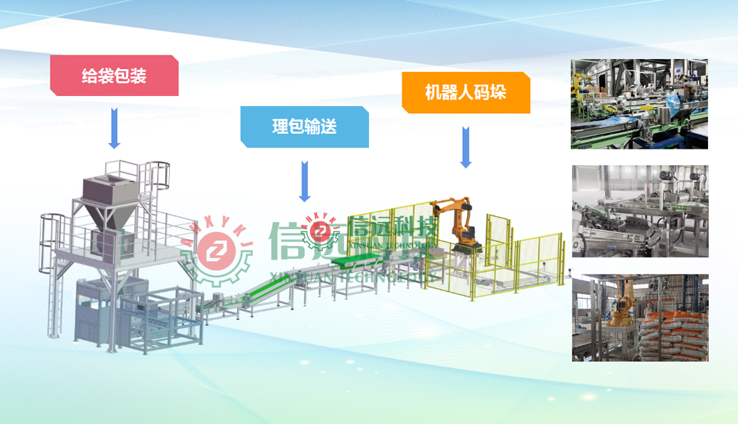 信遠(yuǎn)科技化工重袋包裝碼垛生產(chǎn)線設(shè)備,將包裝機上方緩存料倉內(nèi)的物料,自動計量充填進(jìn)入包裝袋,包裝和碼垛過程為全自動化作業(yè),無需人工參與。重袋包裝碼垛系統(tǒng)由上袋機、包裝機、縫包機、噴碼機、輸送理包系統(tǒng)、碼垛機器人和軌道托盤庫等裝置組成,可以自動完成取袋上袋、套袋夾袋、計量充填、縫包輸送、理包整形,機器人碼垛等一體化過程。