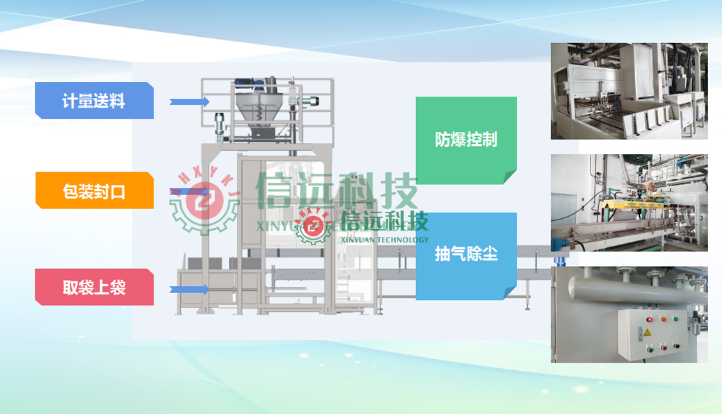 信遠(yuǎn)科技化工超細(xì)粉包裝碼垛生產(chǎn)線設(shè)備,適用于易燃易爆超細(xì)粉物料的包裝生產(chǎn)。該套設(shè)備由上袋機、包裝機、熱封縫合機、重檢機、金檢機、噴碼機、輸送機、碼垛機器人、軌道托盤庫,以及脈沖除塵器、防爆電機、防爆電氣柜、防爆管線等裝置組成。該包裝機的夾袋下料裝置采用底充式充填技術(shù),下料通道和除塵通道分離,最大限度減少粉塵外溢;重檢機、金檢機可以實時檢測包裝重量精度與物料金屬雜質(zhì),確保產(chǎn)品質(zhì)量合格。