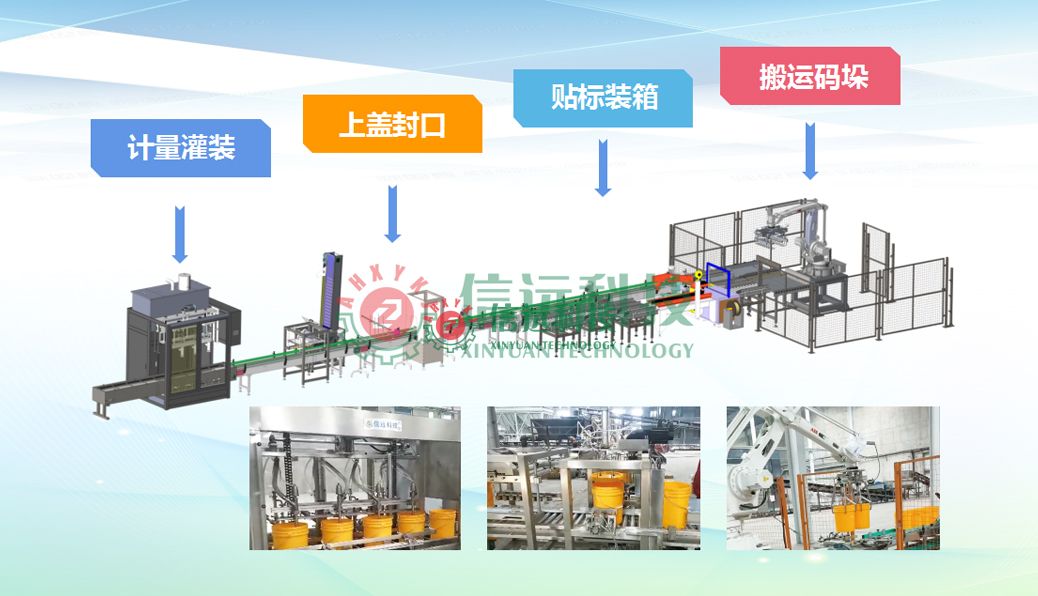 信遠(yuǎn)科技化工液體灌裝碼垛生產(chǎn)線設(shè)備,由灌裝機、上蓋旋蓋機/壓蓋機、鋁箔封口機、噴碼機、貼標(biāo)機、裝箱封箱機、捆扎機,以及碼垛機器人組成。灌裝設(shè)備有大桶灌裝和小瓶灌裝兩種機型供選擇,灌裝機具有自動完成進(jìn)桶/進(jìn)瓶、定位、計量、灌裝、出桶/出瓶等一系列功能,適用于化工行業(yè)不帶氣體的清液、黏稠液、懸浮液等物料產(chǎn)品的灌裝生產(chǎn)。