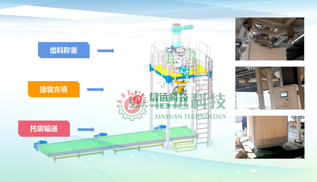 信遠(yuǎn)科技化工噸袋包裝機組,通過高精度傳感器,自動完成夾袋、吹袋、計量、灌裝、落袋、脫帶、輸送等工作程序。操作簡單方便,自動化程度高,灌裝精度高,灌裝速度快,灌裝重量可以在500-2000公斤之間調(diào)節(jié)。適用于化工行業(yè)顆粒物料或粉狀物料大型軟袋的自動定量包裝。針對易燃易爆的特殊物料,可以選配具有防爆功能的電氣控制系統(tǒng)。