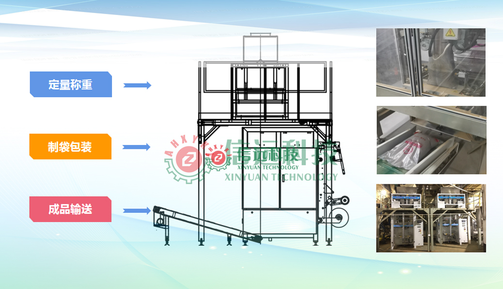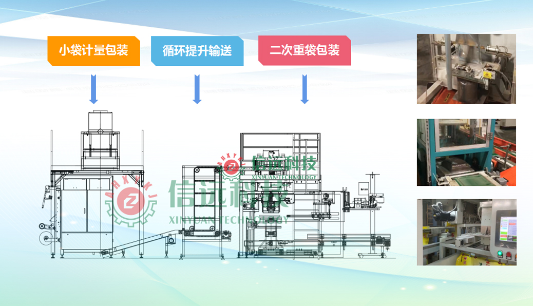 信遠(yuǎn)科技飼料二次包裝生產(chǎn)線設(shè)備,采用PLC控制系統(tǒng),可以實(shí)現(xiàn)小袋自動(dòng)計(jì)量包裝、整形輸送、循環(huán)提升、進(jìn)包整理、計(jì)數(shù)充填、外袋二次包裝、袋口整形、取貼標(biāo)簽、折邊縫包、理包碼垛等全過(guò)程的自動(dòng)化生產(chǎn)運(yùn)行。可以包裝粉狀或顆粒狀的魚蝦育苗飼料產(chǎn)品,循環(huán)提升機(jī)(發(fā)明專利)大大減少了場(chǎng)地占用空間,是飼料生產(chǎn)企業(yè)實(shí)現(xiàn)自動(dòng)化包裝的新型設(shè)備。