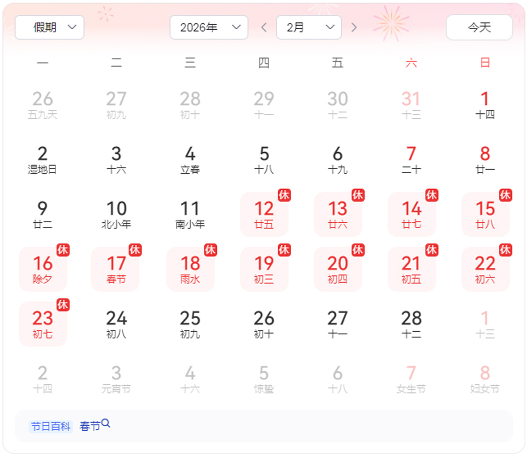 根據(jù)《國務院辦公廳關于2026年部分節(jié)假日安排的通知》精神,結合公司實際情況,現(xiàn)將2026年春節(jié)放假安排通知如下:2026年2月12日(臘月廿五)至2月23日(正月初七),共12天。2月24日(正月初八)正式上班。